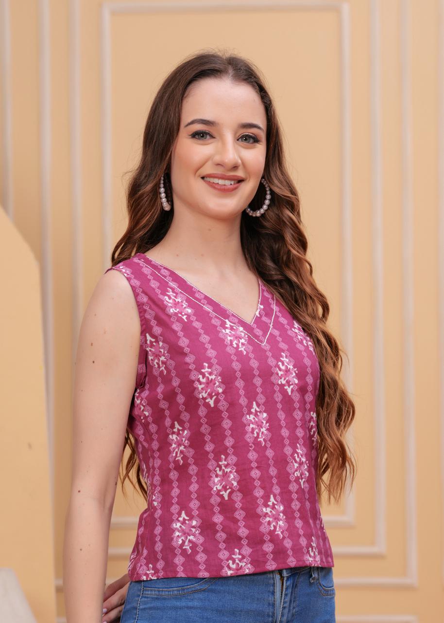 Elevate your everyday style with this sleeveless purple peplum top featuring an ethnic-inspired print. Made from soft, breathable cotton, this top comes with a high neck and a flattering gathered waistline that creates a comfortable flared silhouette. The mid-hip length adds ease of movement, making it perfect for casual outings or semi-formal days. Style it with white jeans or tapered trousers for a fresh and chic look.